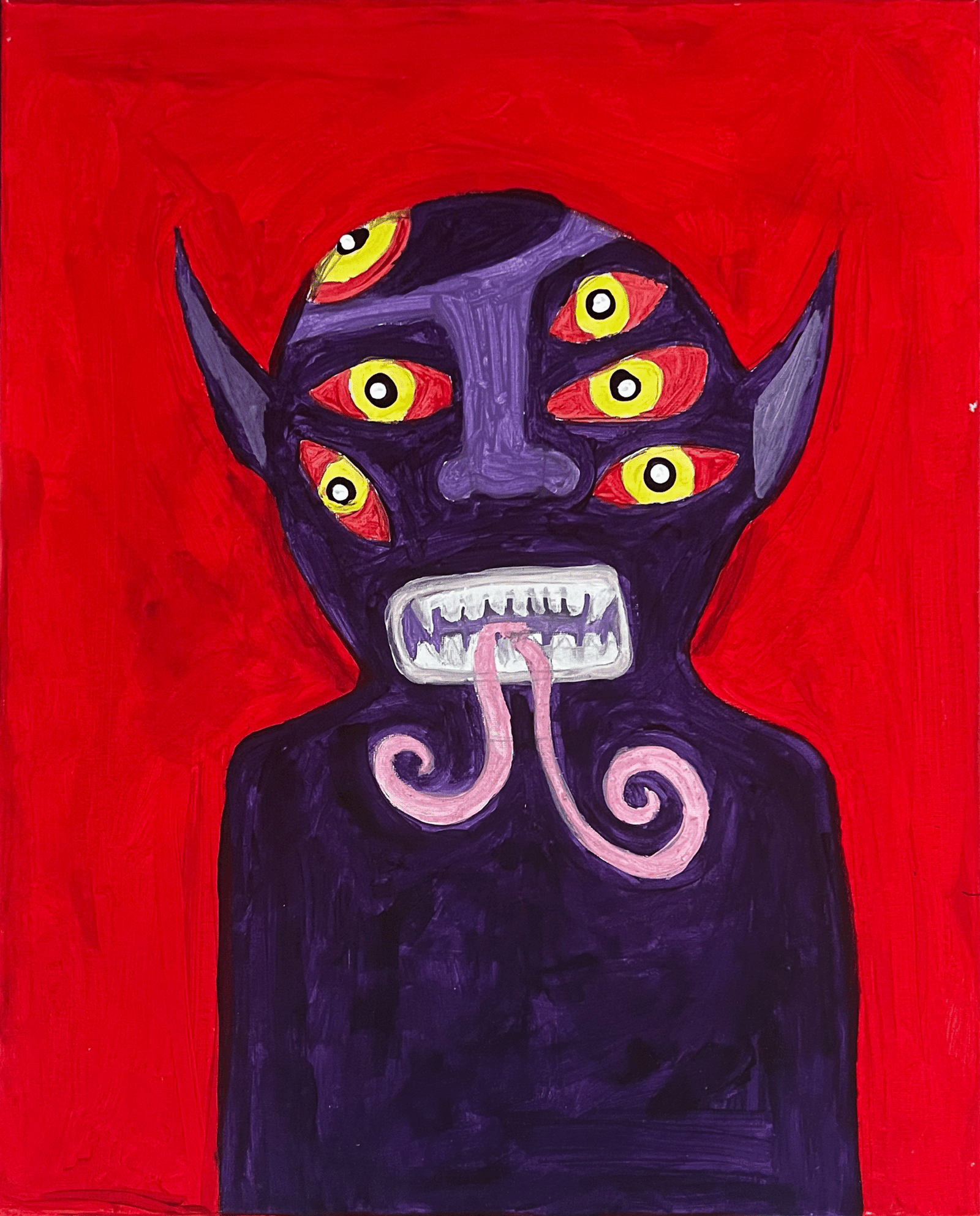A purple body with two emerging tongues, red eyes, and yellow irises stands against a red background.