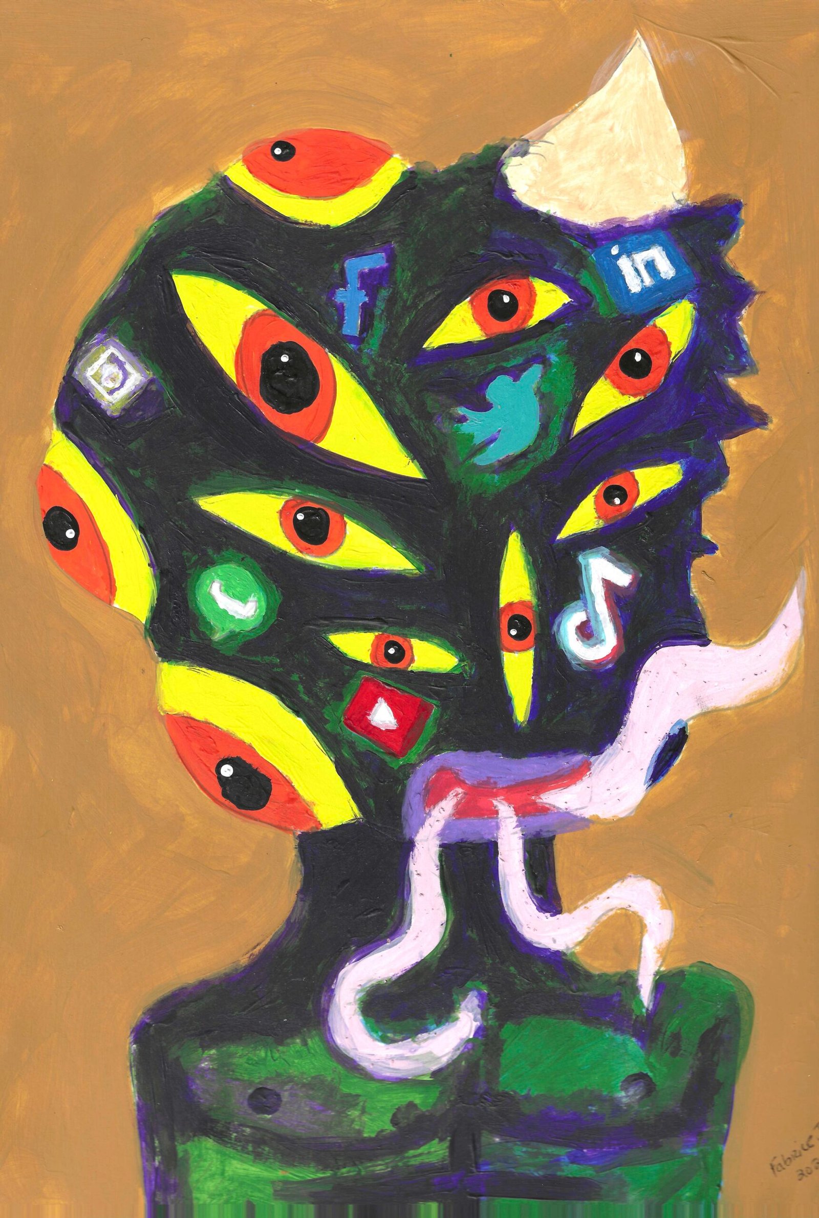 Social media logos cover a purplish body with three tongues and yellow eyes in this commentary on digital obsession.