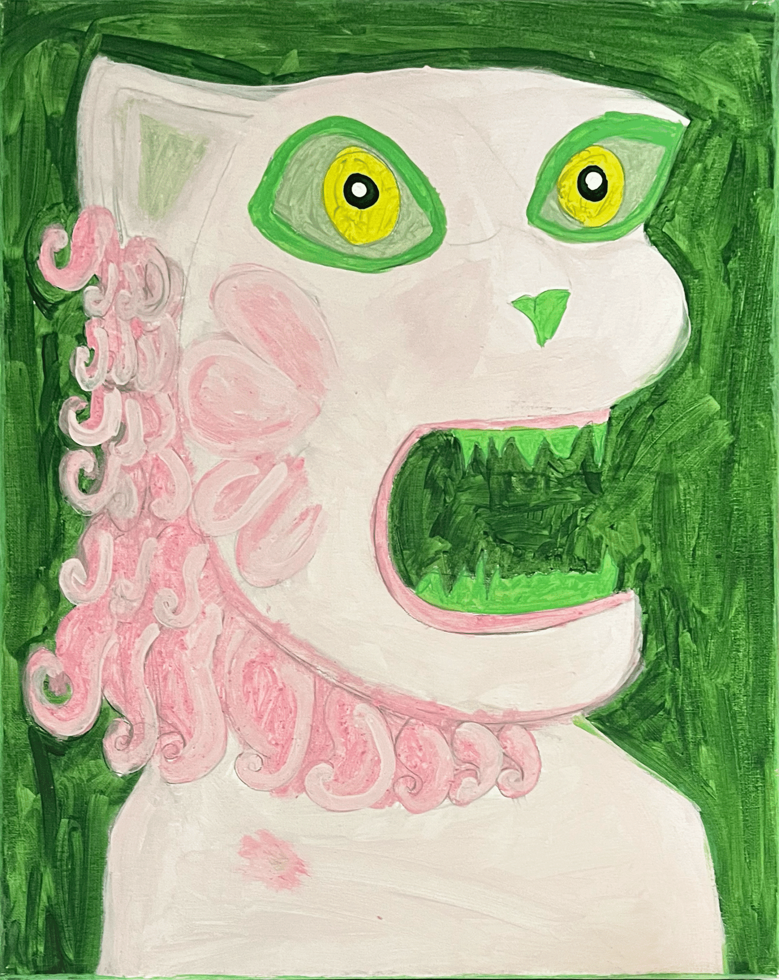 A pink tiger with green eyes, a pink beard, and open teeth appears against a green background.
