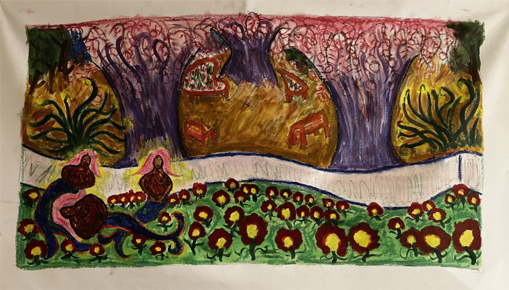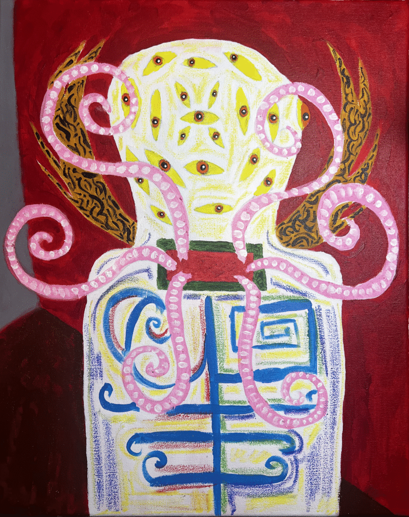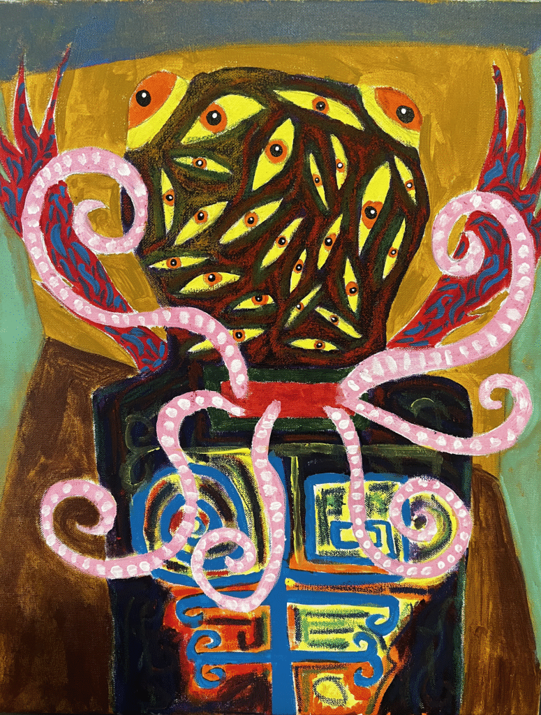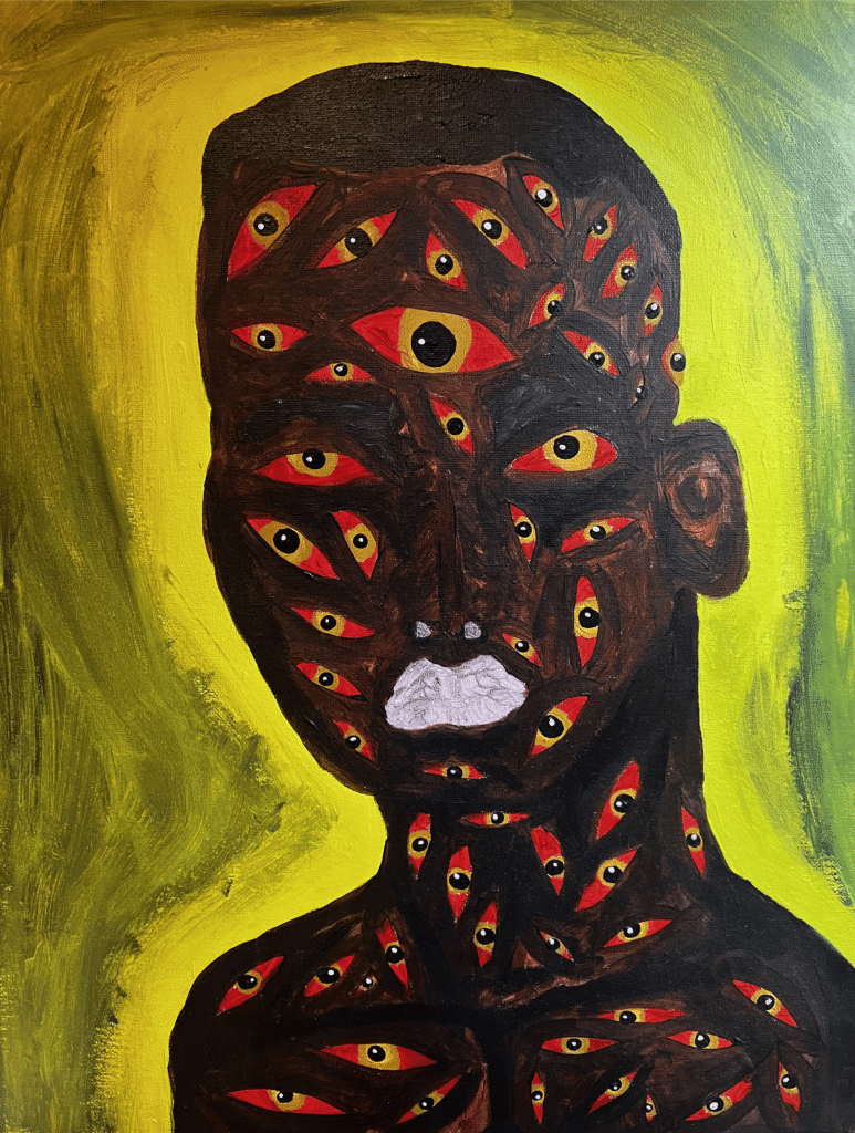 Guerrier’s multi-eyed figures witness the hospice of modernity, its dying insistence on the unified, bounded self giving way to postcolonial futures. Drawing from Vodou cosmologies and Caribbean surrealism, his work maps the self as crossroads: porous, relational, co-authored by ancestors, spirits, community, nature, and emerging futures. The many eyes represent this plurality, identity as a threshold where past and future, individual and collective, spirit and matter converge simultaneously. Each gaze tracks a different timeline, a different voice within the self. Papa Legba, the Vodou gatekeeper of crossroads, becomes the conceptual architect through which all his series operate, and through whom Guerrier insists that identity, place, and power are never fixed. They are perpetually negotiated at the crossroads between worlds, where the seen and unseen forces of existence make and unmake us. In these liminal spaces, new forms of being are continually imagined into life.