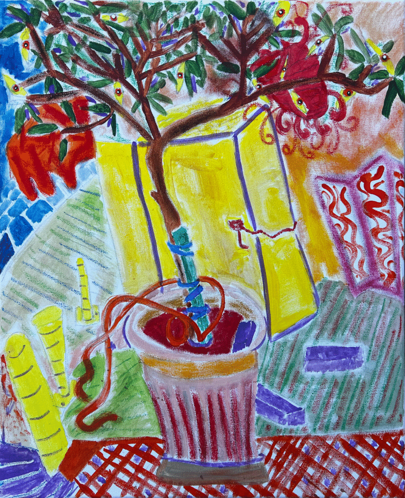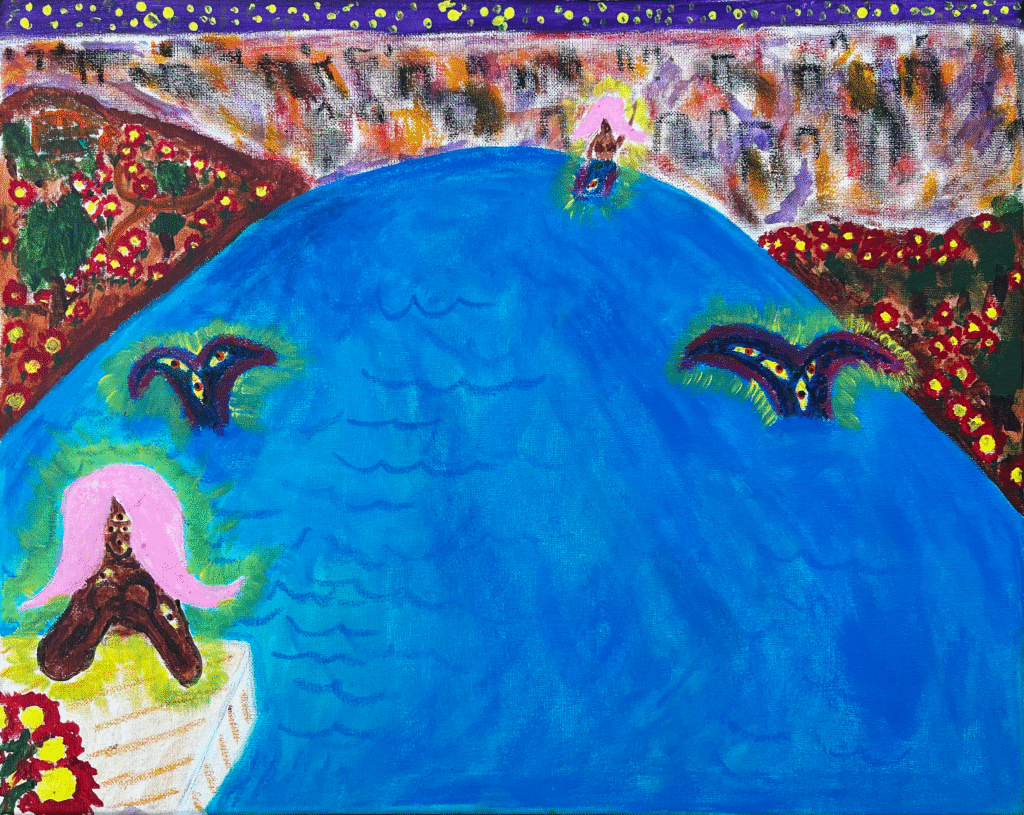 Guerrier’s multi-eyed figures witness the hospice of modernity, its dying insistence on the unified, bounded self giving way to postcolonial futures. Drawing from Vodou cosmologies and Caribbean surrealism, his work maps the self as crossroads: porous, relational, co-authored by ancestors, spirits, community, nature, and emerging futures. The many eyes represent this plurality, identity as a threshold where past and future, individual and collective, spirit and matter converge simultaneously. Each gaze tracks a different timeline, a different voice within the self. Papa Legba, the Vodou gatekeeper of crossroads, becomes the conceptual architect through which all his series operate, and through whom Guerrier insists that identity, place, and power are never fixed. They are perpetually negotiated at the crossroads between worlds, where the seen and unseen forces of existence make and unmake us. In these liminal spaces, new forms of being are continually imagined into life.